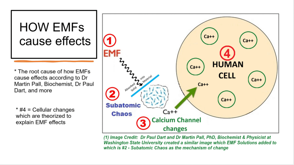 Calcium Channels: Double ion calcium channels on nearly every cell in the human body. It has been theorized and shown by Dr Martin Pall, PhD, Biochemist & Physicist, and others that these are the mechanism in which the low frequency radiation (EMF) can affect us.
